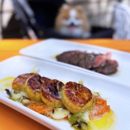 Delicious food with a relaxing outdoor space. Gluten free menu for sensitive and celiac. I am gluten sensitive so I was able to order some foods using the shared fryer, however with celiac, the kitchen can prepare foods without deep frying. We ordered Patatas Bravas (potatoes) with the most pungent garlic aioli and a tomato sauce that perfectly complemented each other. I also ordered the Crispy Chicken Skin Thighs and one again, the different spices and different sauces were a standout. Unique and addicting. Friends ordered Croquetas and the Dungeness crab dishes and said it was so delicious. We also shared the roasted beet salad, Baby Kale salad, and Calamari which were well prepared and delicious. We had the pleasure of having Leo as our server, who was both charming, friendly, and overall had a great energy. Highly recommend Bravas Bar de Tapas and will definitely be going back!