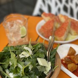 It's been too long! Four of us recently returned to Bravas on one of the hottest heatwave nights. Outdoor seating was the only option available so we sat at the outdoor bar. Despite the heat, the fun bartending team and service staff kept the water, drinks, and food flowing! We ordered a bunch of delicious savory plates to share including our faves: -pan tomate -kale salad -original BFG fried chicken (a larger portion meant for sharing) with a delicious kale salad and insane garlic toast -roasted beets -croquetas... I kept it simple with a cold glass of local white wine. Our crew also ordered sangria (white and red), a margarita, and another seasonal cocktail. We look forward to more nights on the Bravas patio when it's hopefully a few degrees cooler!